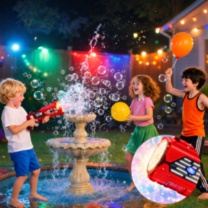 • Buborékfújó pisztoly átlátszó műanyagból LED világítással – gyerekeknek, fotózáshoz, esküvőre (BBJ)
