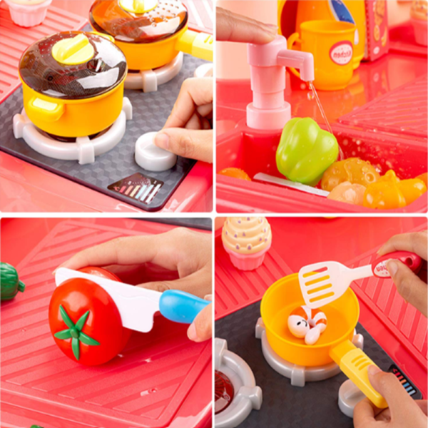 A játékkonyha egyik legizgalmasabb eleme a pumpálható vízcsap 🚰, amely valódi vizet keringet a mosogatóban. A gyerekek játék közben „elmosogathatják” az edényeket vagy megmoshatják a zöldségeket – így a szerepjáték még realisztikusabbá válik.