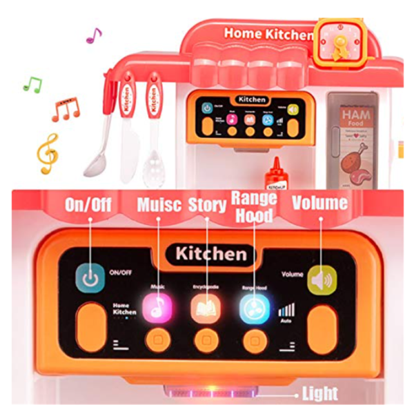 A beépített interaktív fény- és hanghatások 🔊💡 a főzés élményét idézik: a főzőlap és sütő használata közben valósághű hangok hallhatók, a világító elemek pedig igazi konyhai hangulatot teremtenek.