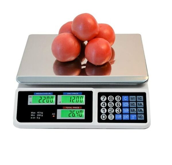 Digitális árazómérleg 40 kg-ig – árszorzós bolti mérleg 3 LCD kijelzővel – 5 gramm pontosság, rozsdamentes acél mérőtálca (BBD)(BBA)(BBKM)