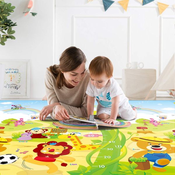 Kétoldalas mintázat – egyik oldalán színes betűk, kedves figurák és vidám motívumok fejlesztik a kicsik látását és kreativitását, a másik oldalon pedig aranyos zsiráfok és állatok várják, hogy felfedezzék őket. 🦒🐘