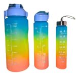 Háromrészes motivációs kulacs szett, kék-lila-narancssárga színkombinációban, 2L, 900 ml és 300 ml méretű palackokkal