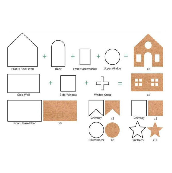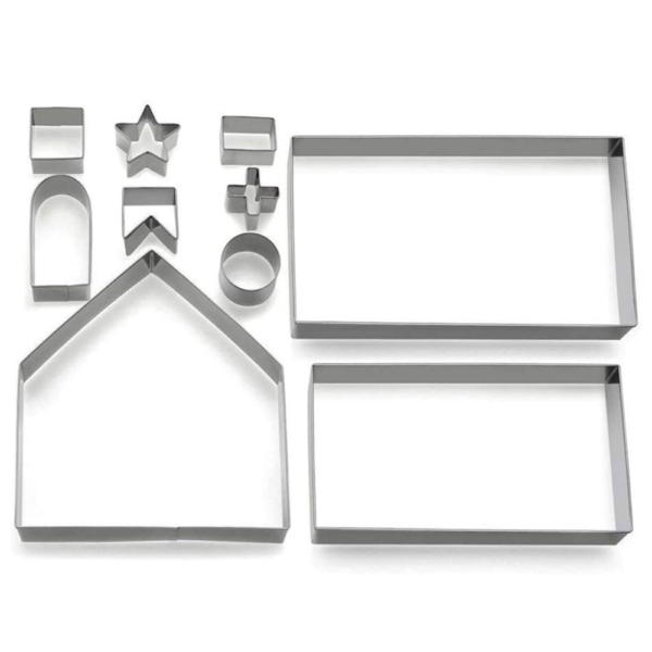 A komplett készlet segítségével gyerekjáték a tökéletes mézeskalács ház elkészítése – még kezdők számára is! A csomagban található többféle szaggatóforma segítségével könnyedén kialakíthatod a ház minden elemét: falakat, tetőt, ablakokat, ajtót és kéményt. 🏠