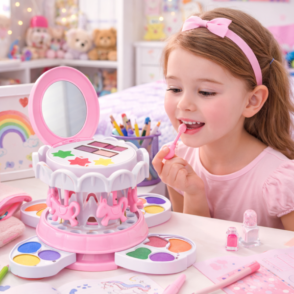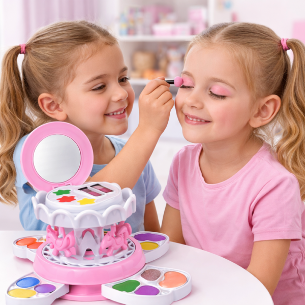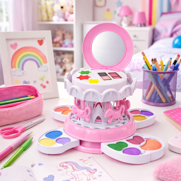 A körhinta ihlette sminkkészlet nem csupán egy játék, hanem egy színes alkotóműhely, ahol a gyerekek felfedezhetik a színek, formák és önkifejezés világát – játékosan és örömmel.