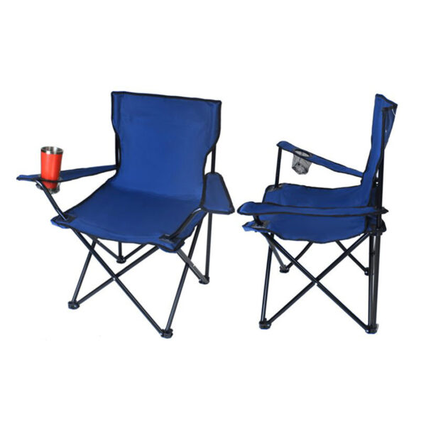 Összecsukható és könnyen hordozható kempingszék italtartós karfával és 120 kg teherbírással – kék horgászszék (BBL)