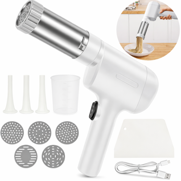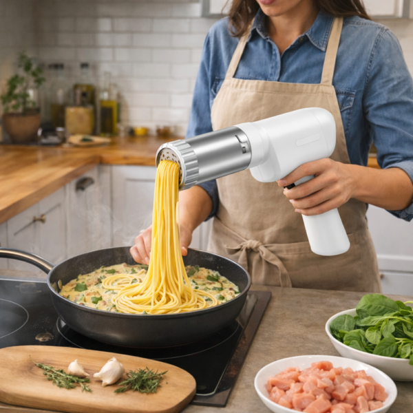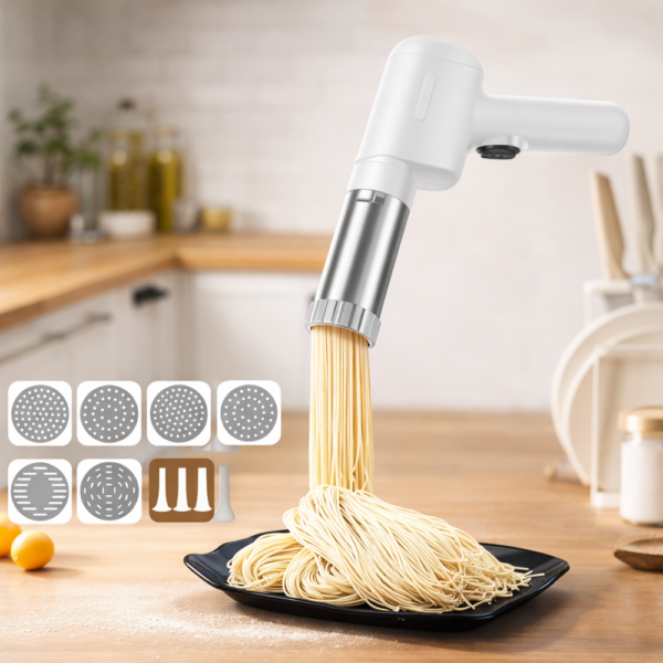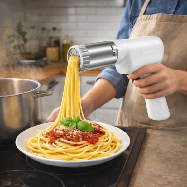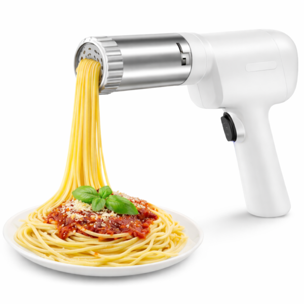 A PastaMaster elektromos tésztakészítő egy modern, vezeték nélküli konyhai eszköz, amely megkönnyíti a házi tészták elkészítését. Az automata tésztaprés rendszernek köszönhetően egyszerűen és gyorsan készíthetsz különféle tésztákat – legyen szó spagettiről, széles tésztáról vagy lapos metéltről.