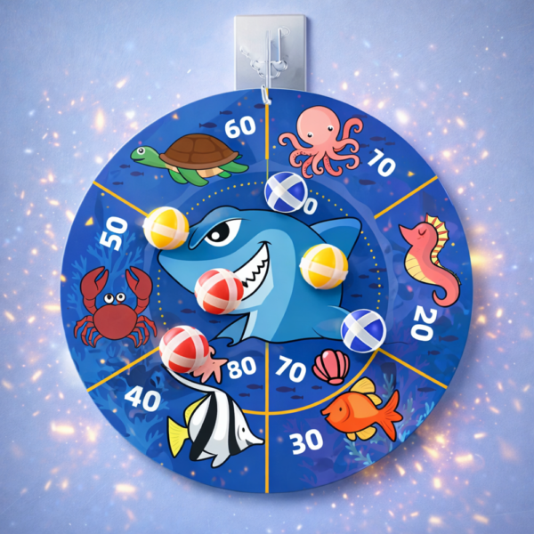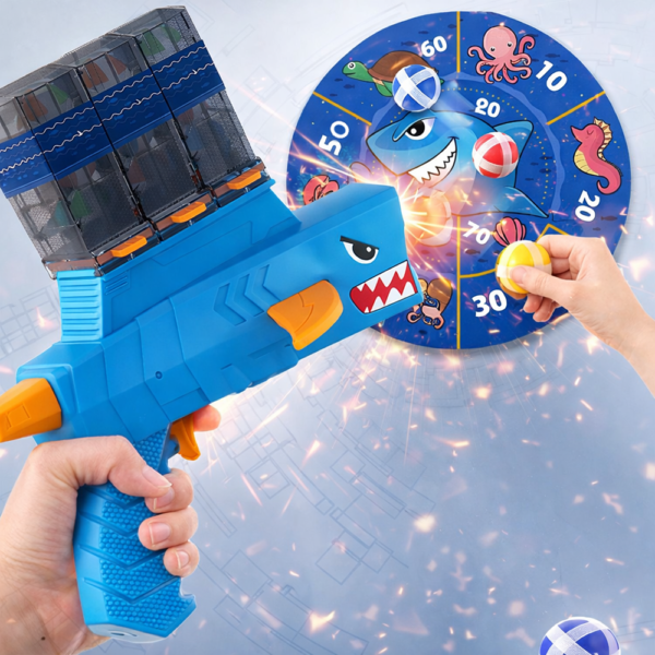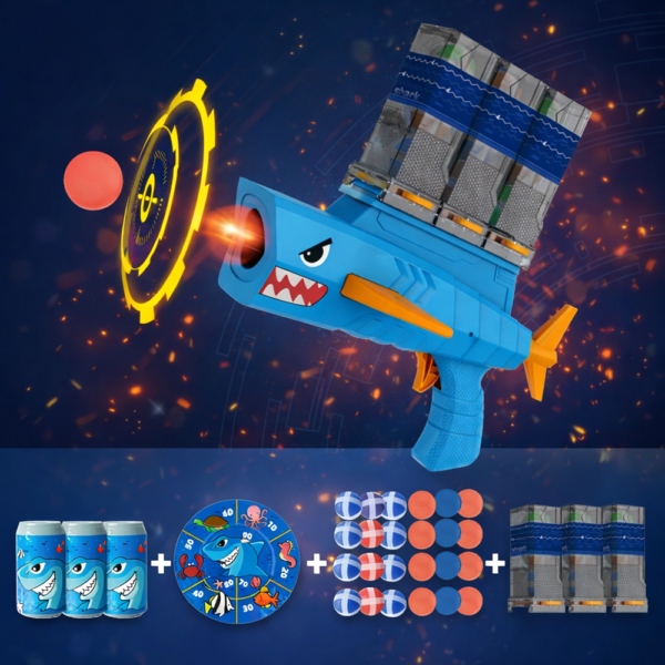 A különleges cápás megjelenés azonnal felkelti a gyerekek figyelmét. A célpontok is cápás mintával készültek, így minden találat még látványosabb és szórakoztatóbb! 😄