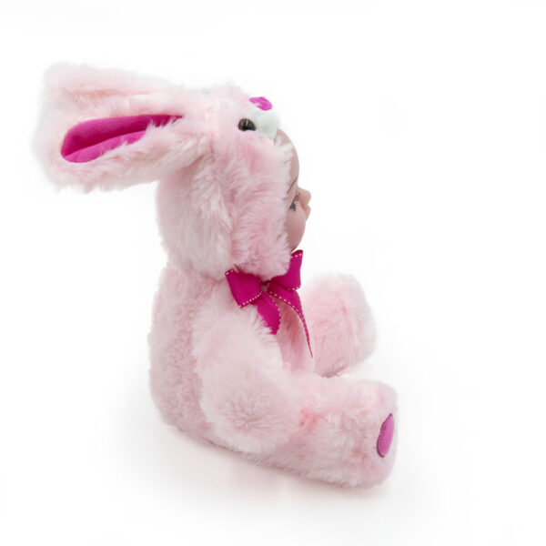 Síró, nevető, beszélő baba óriás szempillával – plüss anyagú nyuszis jelmezben (BBJ)