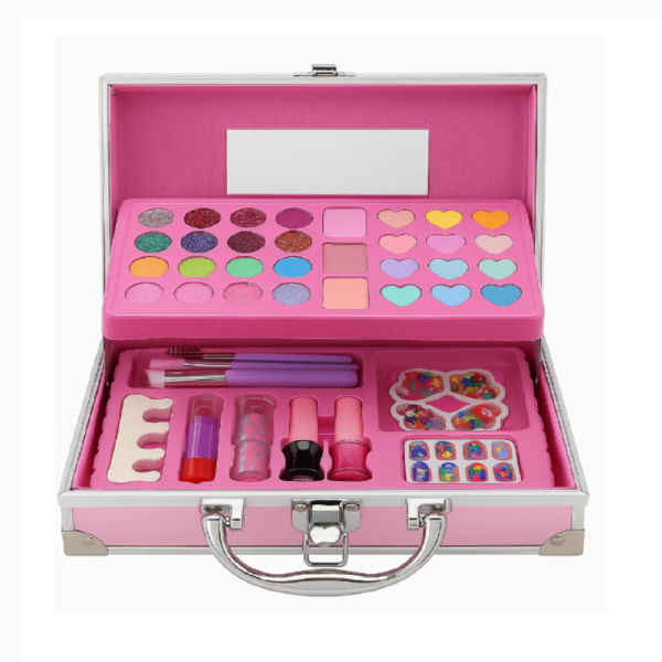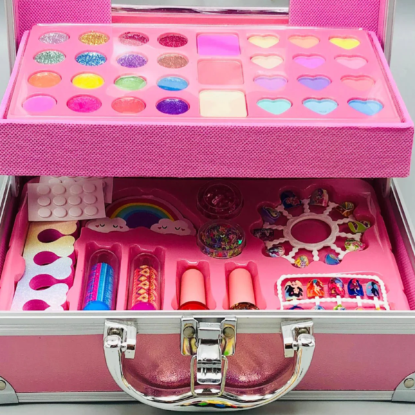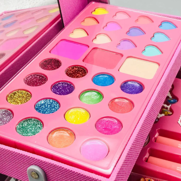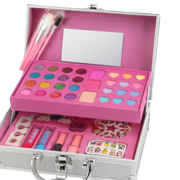 A készletben található színes szemhéjpúderek, csillámos árnyalatok, ajakfények és kiegészítők lehetővé teszik, hogy a gyerekek saját sminkeket alkossanak, miközben fejlődik: