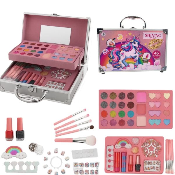 Unikornisos gyerek sminkkészlet fém tárolódobozban – 46 részes ragyogó kozmetikai szett, kreatív játék és ajándék kislányoknak (FX) (BBJ)