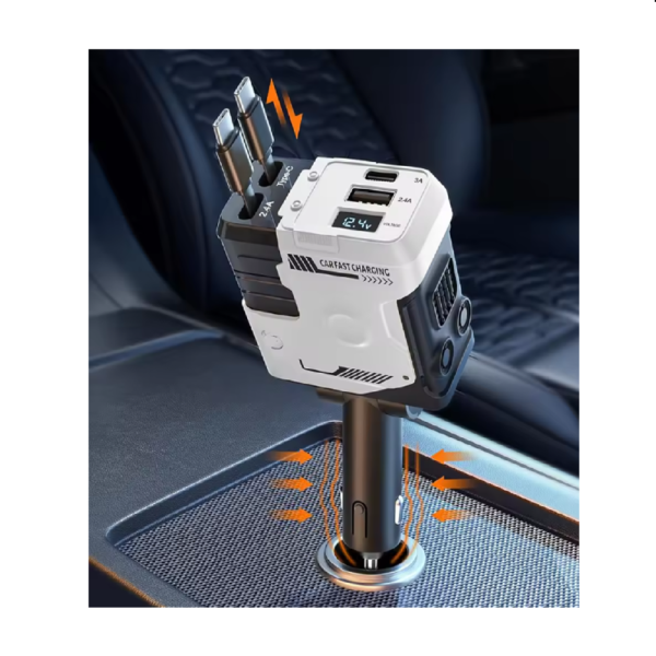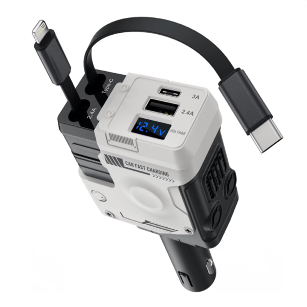 Univerzális autós gyorstöltő 66W – 4 az 1-ben töltő, kihúzható kábelek, USB, Type-C és iPhone csatlakozóval, intelligens védelemmel (BBJH)