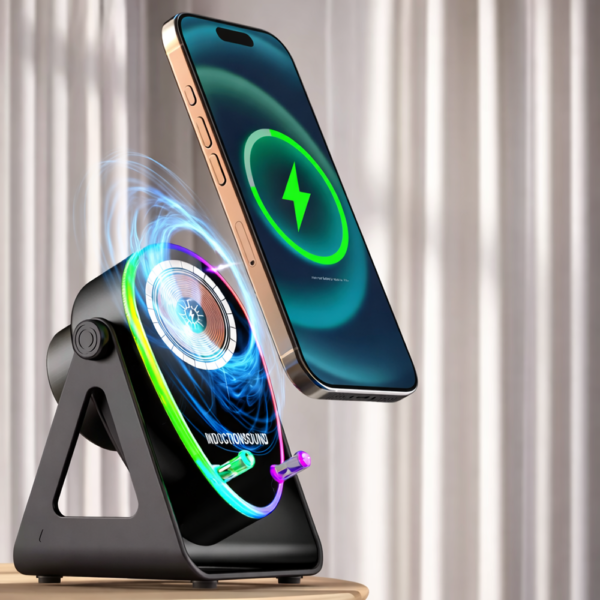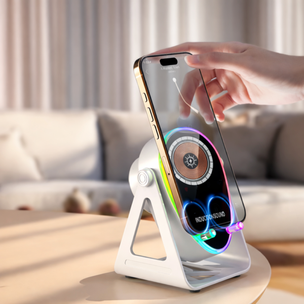 A vezeték nélküli töltős hangszóró telefontartó LED hangulatfénnyel egy innovatív, praktikus és látványos eszköz, amely egyszerre szolgál töltőként, hangszóróként és dekorációként.