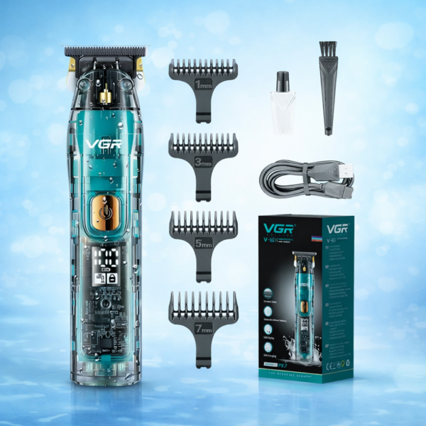 VGR V-961 prémium akkus haj- és szakállvágó – vezeték nélküli trimmer 4 vezetőfésű 1/3/5/7 mm – digitális kijelzővel, átlátszó dizájn (BBD)