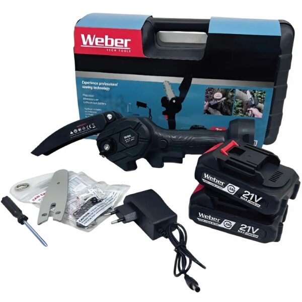 A Weber  akkumulátoros láncfűrész egy könnyű, kompakt és rendkívül hatékony eszköz, amely ideális kerti és ház körüli munkákhoz. Az ergonomikus kialakítás kényelmes fogást és stabil használatot biztosít, miközben a nagy teljesítményű, vezeték nélküli működés megkönnyíti a faágak és kisebb rönkök gyors és precíz vágását.